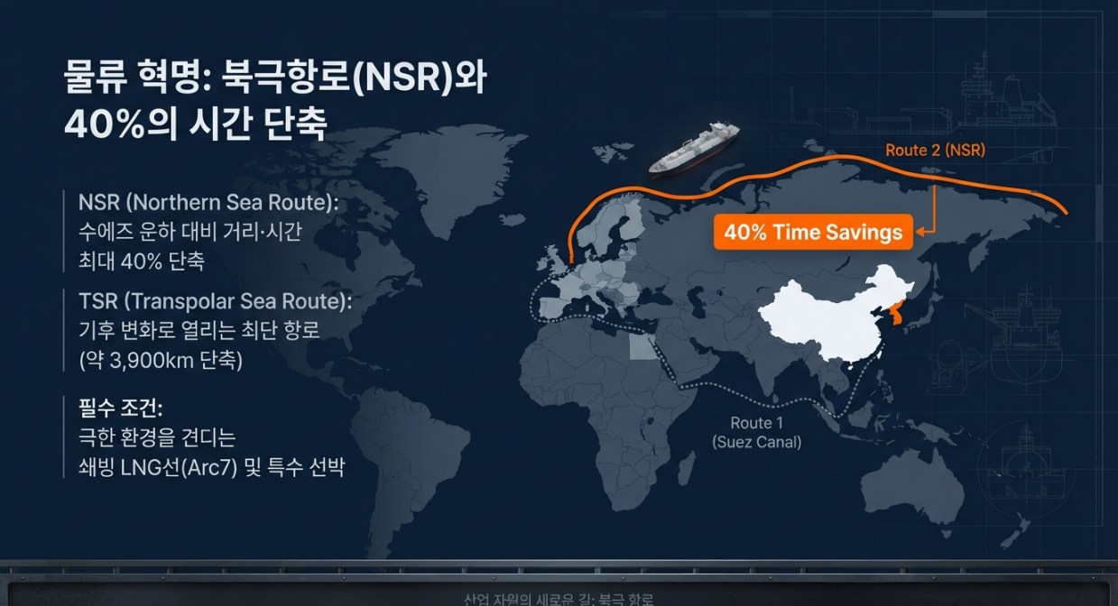 - NSR(Northern Sea Route)은 수에즈 운하 대비 최대 40% 항로 단축이 가능하고, 야말 LNG 프로젝트를 통해 상업성이 입증되었다.