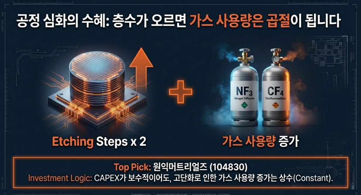 - 공정 복잡도가 증가할수록 식각·플라즈마 장비의 가동률이 선행적으로 상승하며, 원익머트리얼즈 같은 소재·가스 업체들의 실적 가시성이 높아집니다.