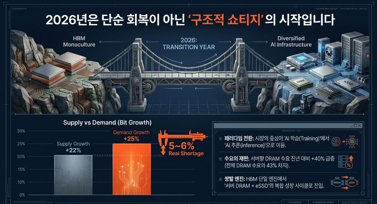 2026년 반도체 업황은 단순한 재고 정상화나 경기 회복 수준이 아니라, **공급과 수요 구조가 완전히 새로 짜이는 ‘패러다임 전환 구간’**에 진입합니다. 과거에는 HBM이 AI 업황을 대표하는 단일 성장 엔진이었다면, 2026년 이후부터는 추론(inference) AI의 보편화와 함께 **서버 DRAM과 eSSD(enterprise SSD)**가 메모리 업황의 쌍발 엔진으로 자리잡게 됩니다.