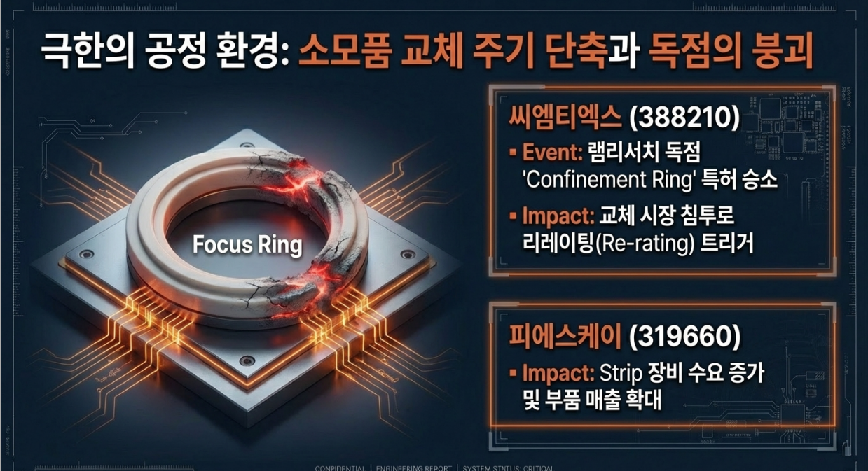 | 씨엠티엑스 | 388210 | 3D NAND 고단화 공정에서 Confinement Ring 등 플라즈마 솔루션 특허 경쟁력 보유, 램리서치 독점 타파. | 2,080 | 7,679 (추정) | 210,000 | 20배 후반 | 특허 승소 기반 Multiple Re-rating 구간. |