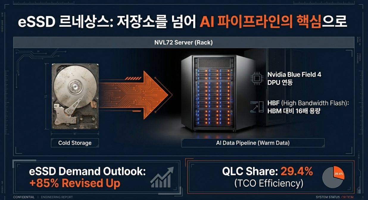 최근 8개월 사이 eSSD 수요 전망은 약 85% 상향(4,836억 GB) 되었습니다. 2026년 기준 eSSD는 전체 NAND 수요의 약 45%까지 확대될 수 있으며, 같은 시점 QLC NAND 비중은 약 **29.4%**까지 올라갈 전망입니다.