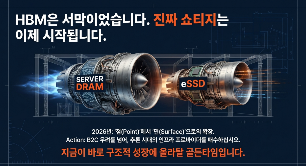 2026년 메모리 업황은 HBM 단일 엔진에서 서버 DRAM + eSSD라는 쌍발 엔진 체제로 완전 전환되는 시기입니다. 이는 단기 유행이 아니라, KV 캐시·Vera CPU·HBF·소버린 AI로 대표되는 컴퓨팅 아키텍처와 자본 할당 구조의 근본적 변화에서 비롯된 결과입니다.