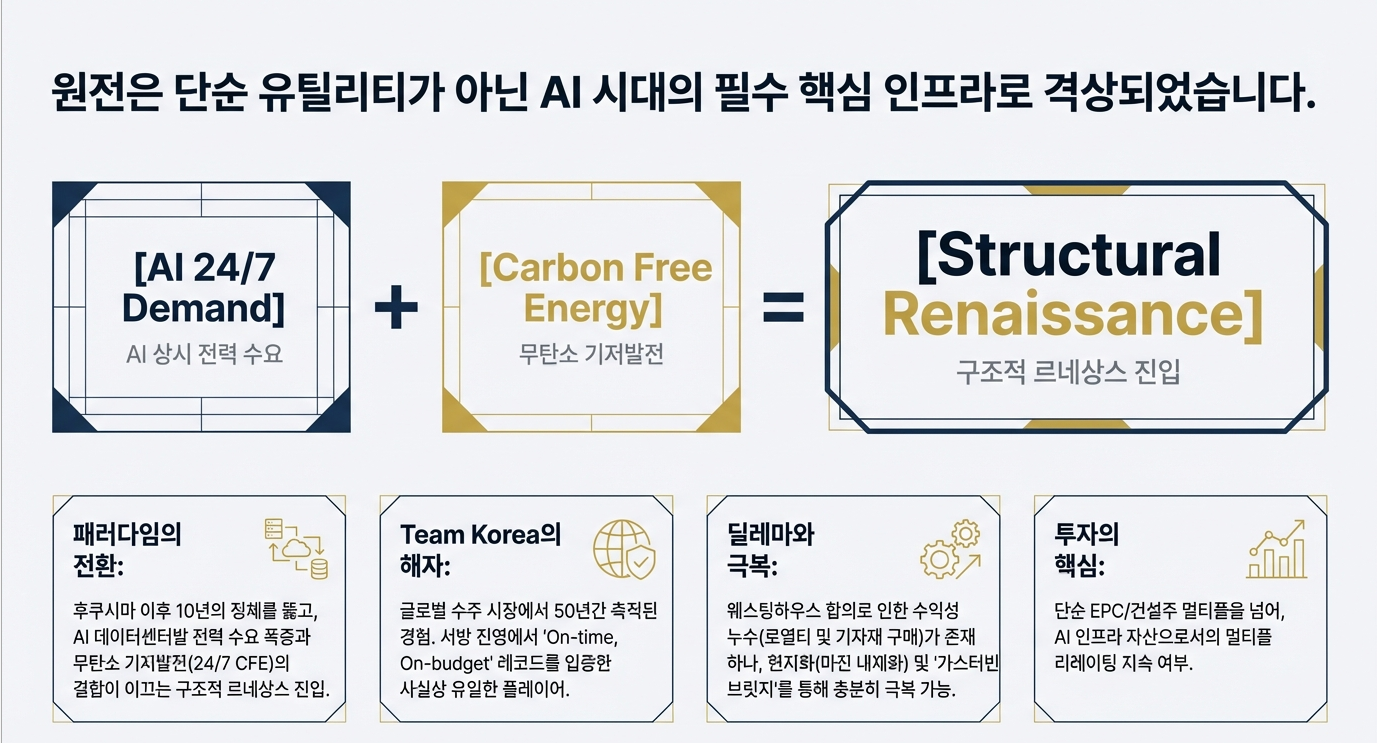 향후 원전 섹터 밸류에이션 리레이팅의 지속 여부는, ① AI 전력 패러다임 변화가 일회성 쇼크가 아닌 구조적 추세라는 점, ② 한-미 원전 동맹이 수익성 훼손 없이 확장 가능한지에 달려 있다.