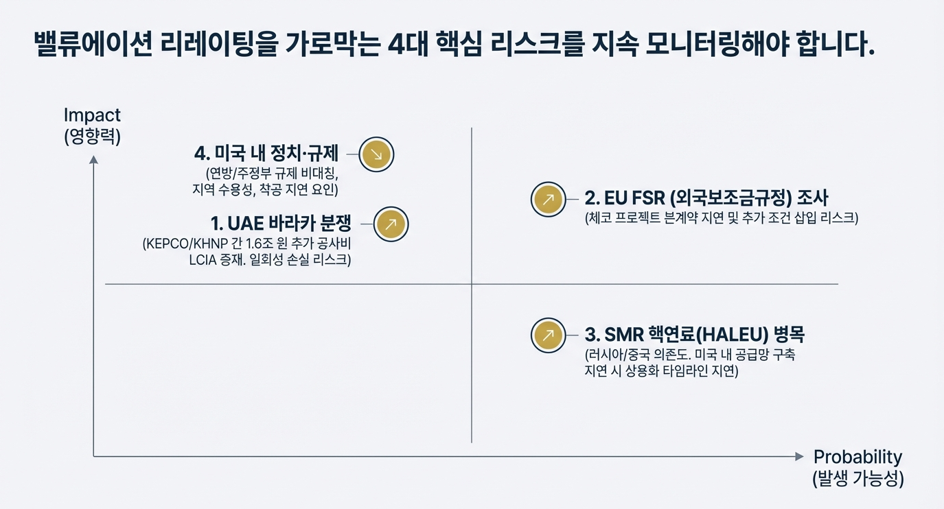 | Bear Case | EC FSR 조사로 체코 프로젝트 지연·조건 악화, 바라카 분쟁 패소에 따른 대규모 충당금, SMR 상용화 일정 지연 | 섹터 신뢰도 훼손, 멀티플 디스카운트 및 Capex 사이클 피크 아웃 논쟁 부각 |
