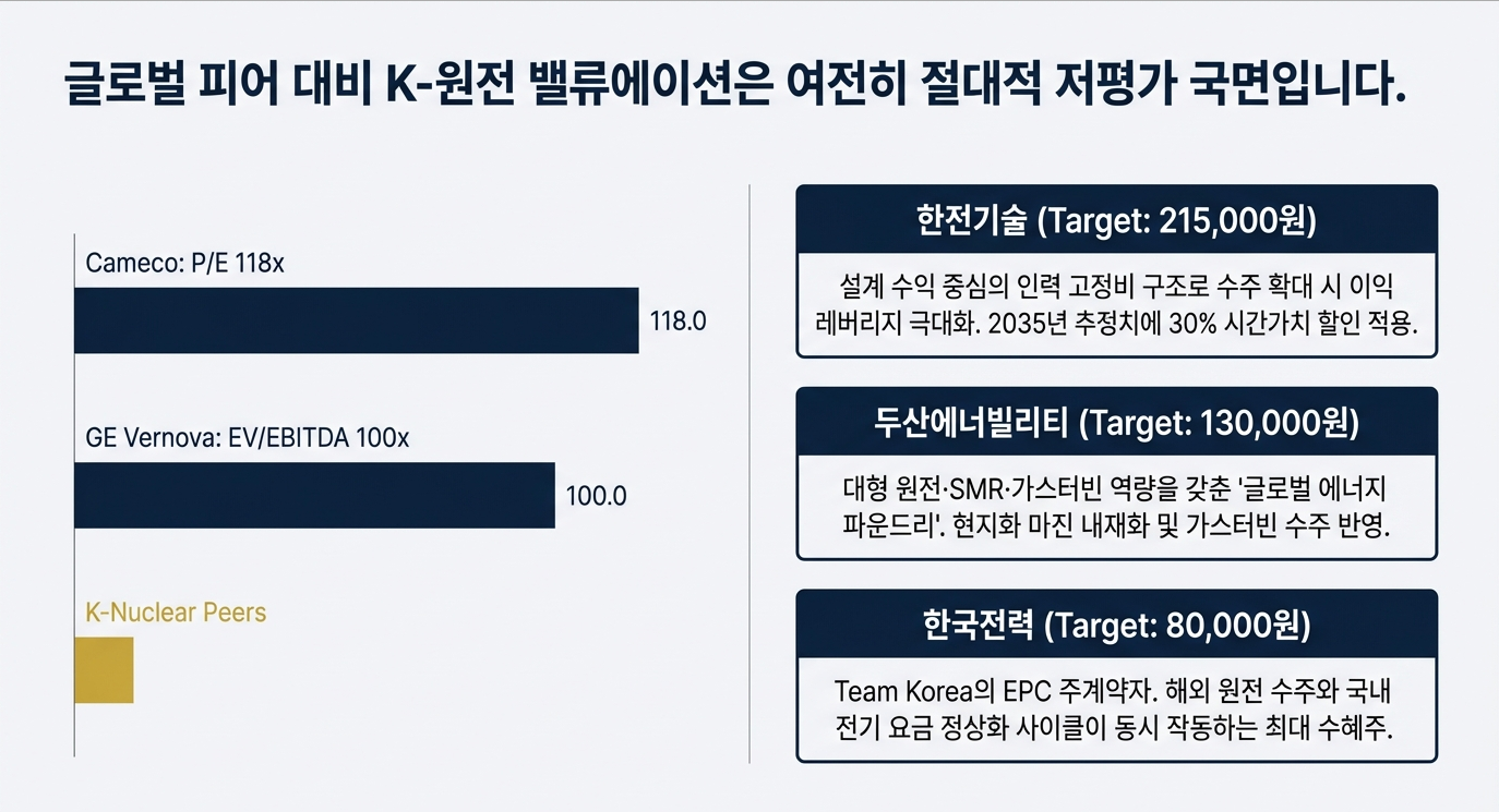 글로벌 피어 밸류에이션은 원전의 전략 자산성을 강하게 반영하고 있다.