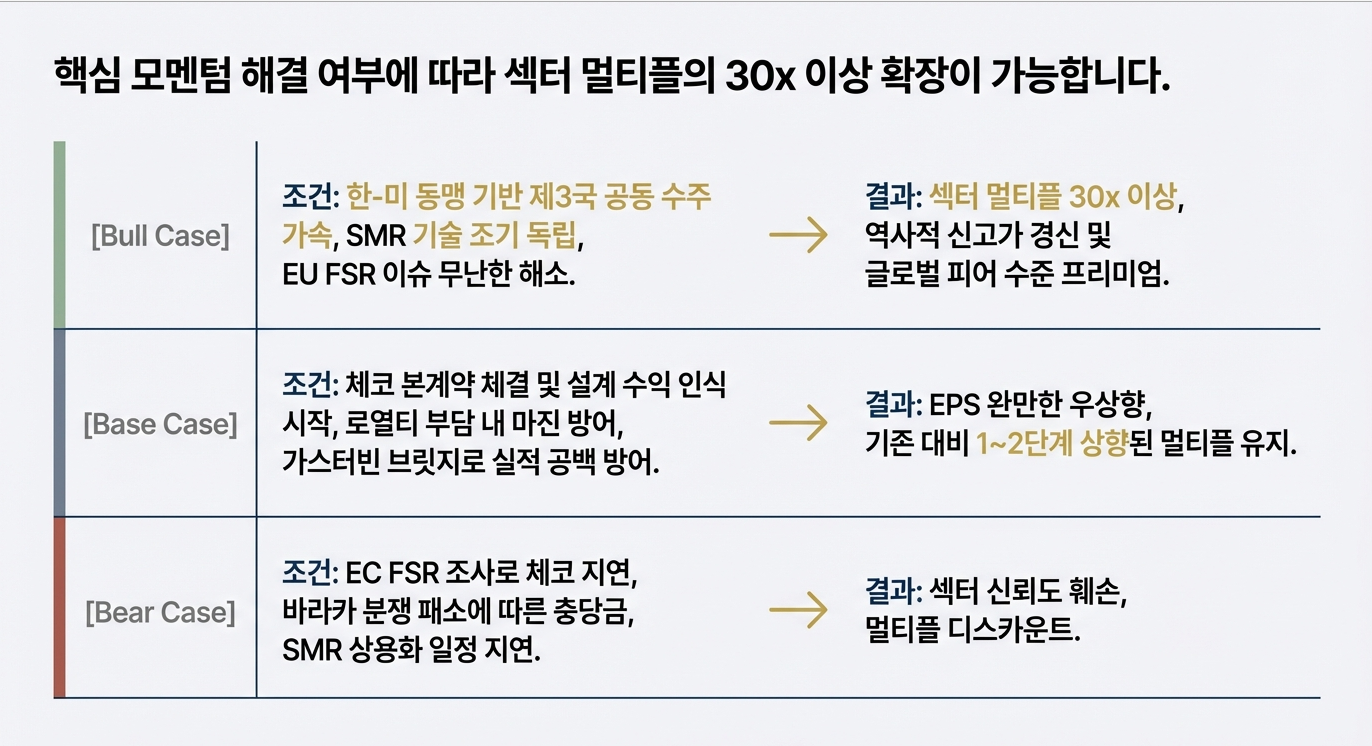 | Bull Case | 한-미 동맹 기반 제3국 공동 수주 가속화, SMR 기술 독립 조기 달성, EU FSR 이슈 무난한 해소 | 섹터 멀티플 30x 이상(핵심 플레이어 기준), 역사적 신고가 경신 및 글로벌 피어 수준 프리미엄 부여 |