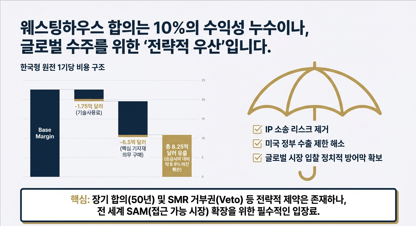 이는 팀 코리아 입장에서 구조적인 마진 헤드윈드이나, 동시에 미국 정부·웨스팅하우스의 이해를 일치시켜 글로벌 시장 입찰에서 ‘정치적 우산’을 확보했다는 의미도 갖는다.