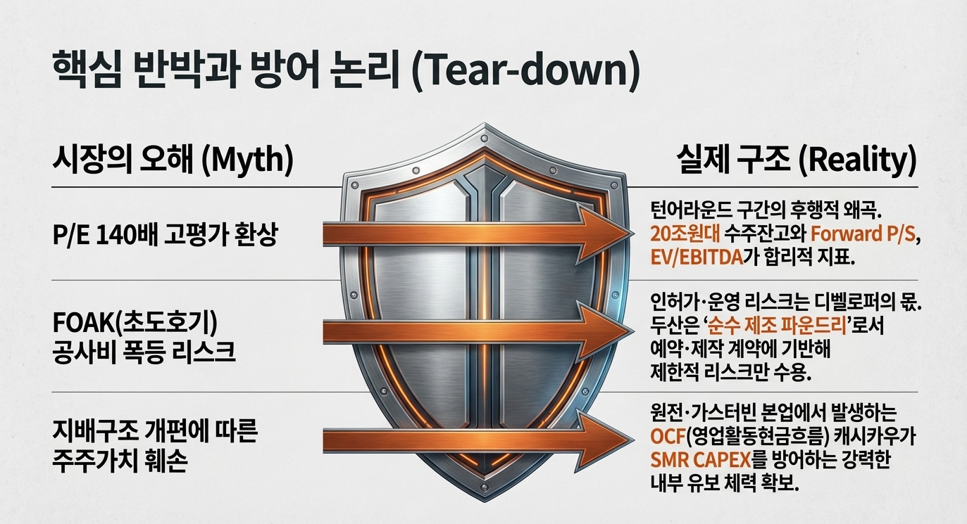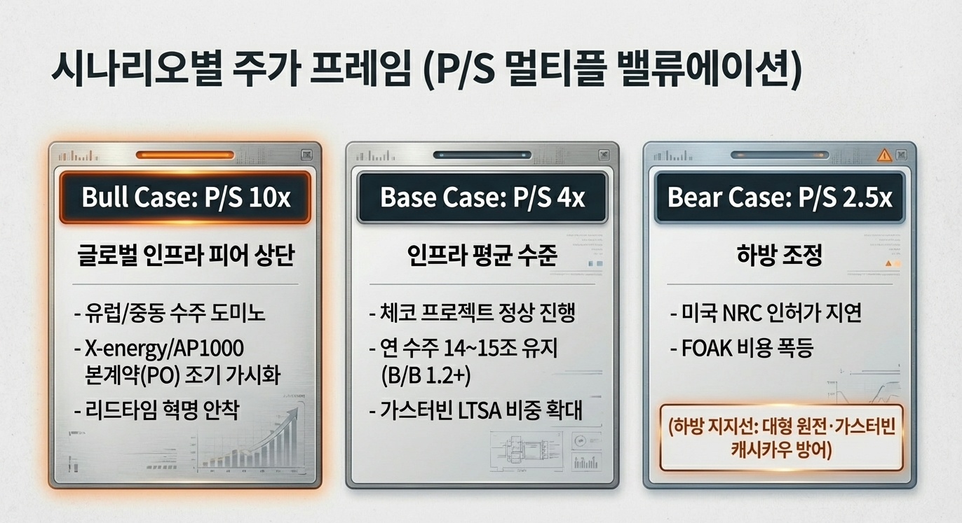 하방에서는 대형 원전·가스터빈·서비스 사업이 캐시카우 역할을 하여 완전 붕괴보다는 점진적 조정에 그칠 가능성이 높다는 점도 함께 고려해야 합니다.