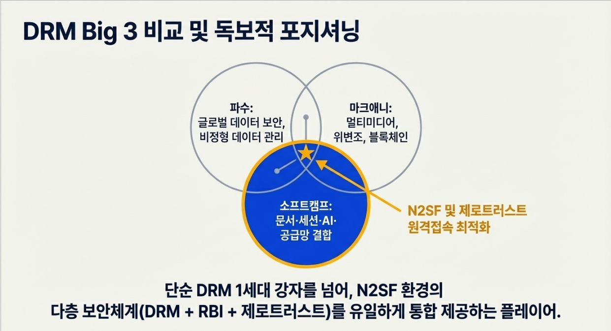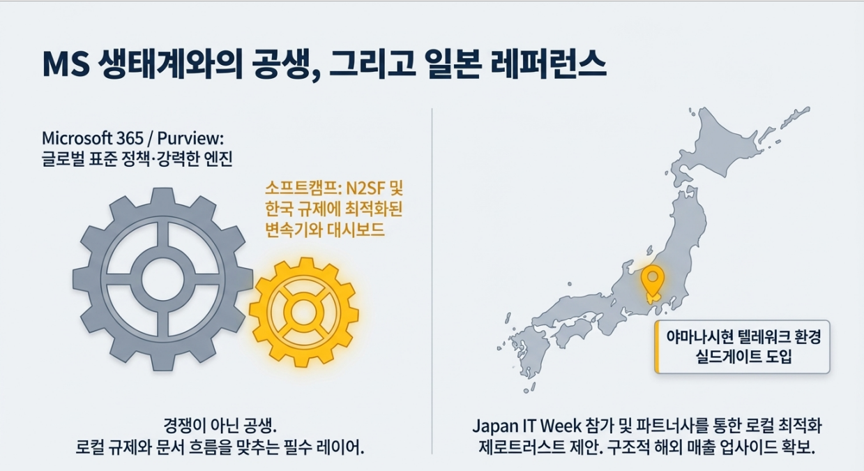 소프트캠프는 MS 위에 올라타 로컬 규제·문서 흐름·접속 시나리오를 맞추는 역할입니다.