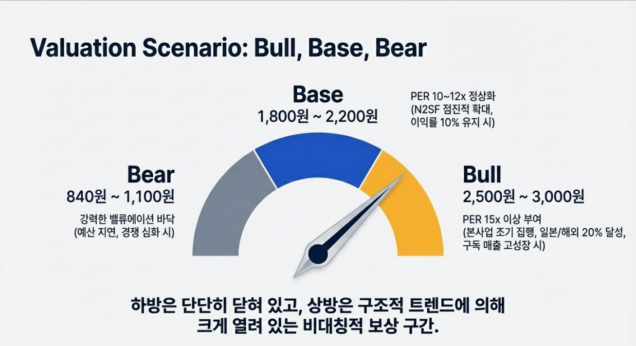 Base Case (PER 정상화 10~12x, 1,800~2,200원 구간)