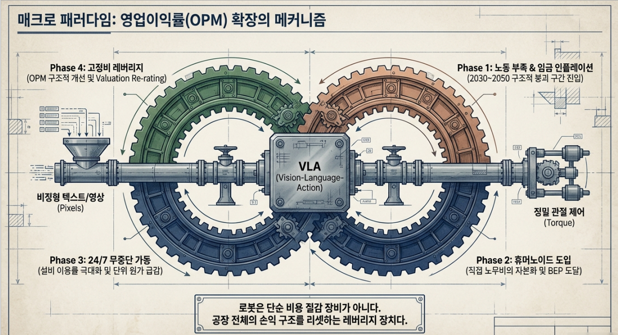 휴머노이드는 단순히 인건비를 줄이는 장비가 아니라, 공장 전체 손익 구조를 리셋하는 레버리지 장치입니다.