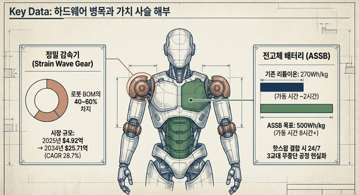 이 두 병목을 풀기 위한 축으로 Jetson Thor / 전고체 배터리(ASSB) / Strain Wave Gear가 부각되고 있습니다.