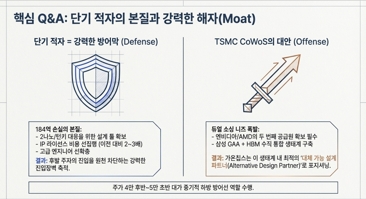가온칩스는 2025년 3분기 누적 기준 약 184억 원의 영업손실을 기록하며 실적 사이클 상 최저 구간을 통과하고 있다. 이는 기존 AI 고객사의 프로젝트 지연, PFN 등 대형 과제 일정 변경, 선단 공정·턴키 대응을 위한 인력·인프라 확충이 동시에 겹치며 나타난 ‘빅 배스(Big Bath)’ 성격의 조정 국면으로 해석할 여지가 크다.