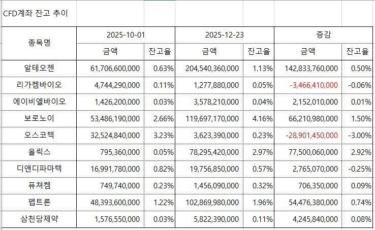 아래 표는 주요 바이오 종목들의 10월 초 대비 12월 23일 기준 CFD 잔고 변화를 보여줍니다.