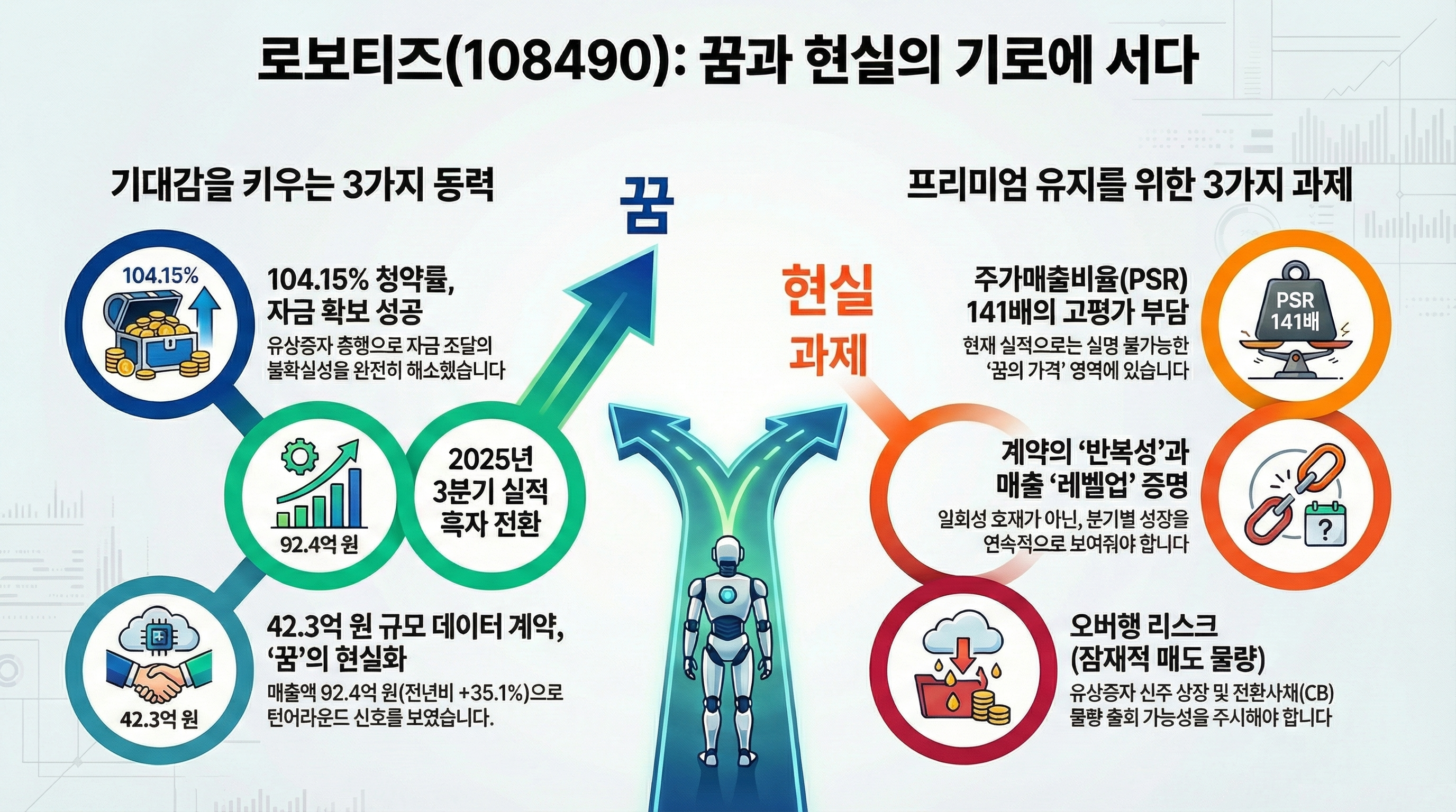 청약률 100% 초과는 기존 주주들이 "이 회사 더 클 거니까 돈 더 낼게!"라고 한 것과 같습니다. 로보티즈는 사업 자금을 성공적으로 확보했고, 돈 걱정은 덜었다는 긍정적인 신호입니다.