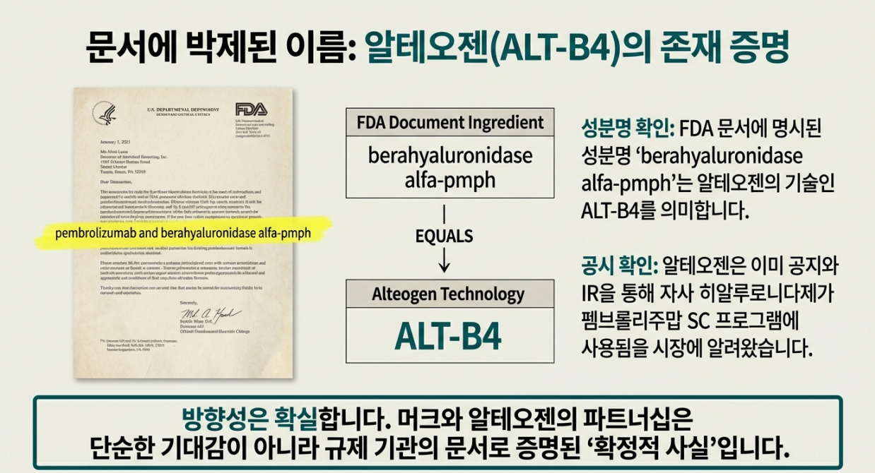 여기서 berahyaluronidase alfa-pmph는 알테오젠의 히알루로니다제(ALT-B4)와 연결되는 성분으로, 알테오젠도 파트너 MSD의 키트루다 SC/QLEX 허가 및 ALT-B4 적용 사실을 IR로 공지해 왔습니다.