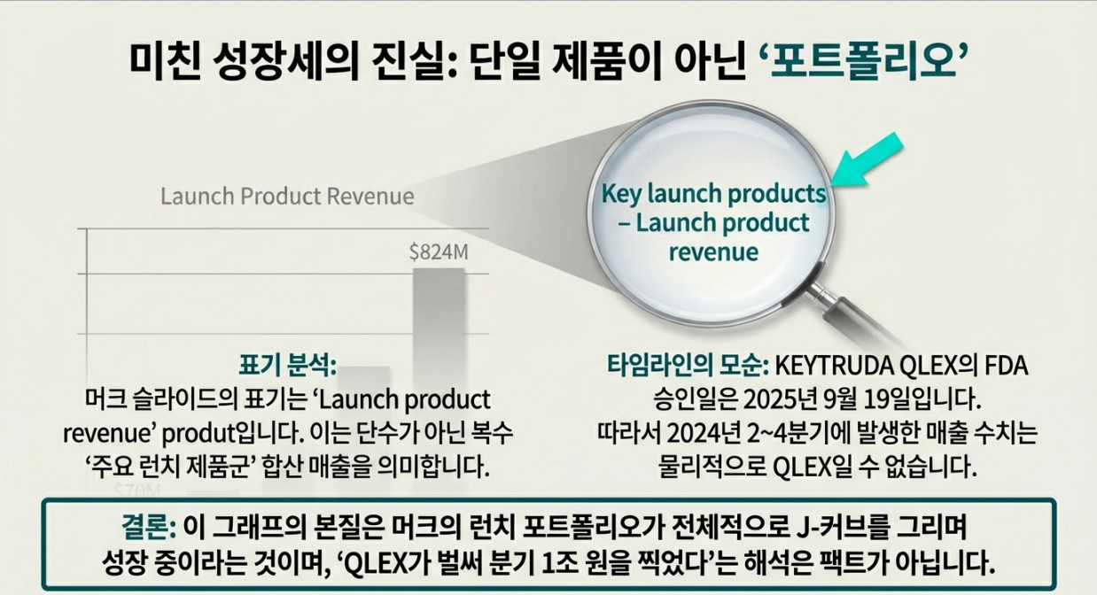 머크 슬라이드 제목이 **“Key launch products – Launch product revenue”**로 되어 있어, 위 수치는 ‘주요 런치 제품군(복수)’의 매출 흐름입니다. 따라서 “QLEX가 2024년 2Q부터 매출 발생” 같은 단정은 불가합니다.