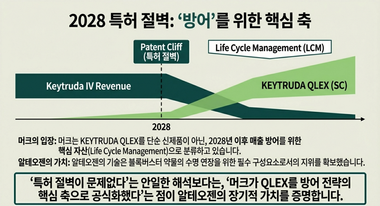5. 2028년 특허 절벽? “알테오젠과 함께라면 문제없다” → 공식 문서 기준으론 ‘방어전략의 한 축’이 더 정확 🛡️