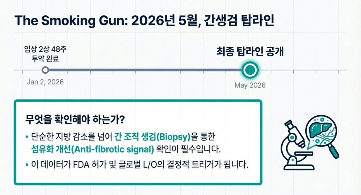 회사는 임상2상 48주 투약이 2026년 1월 2일 완료됐다고 밝혔고, 이제 **간 조직 생검(Biopsy)**을 포함한 최종 탑라인을 2026년 5월 공개하겠다고 했습니다.