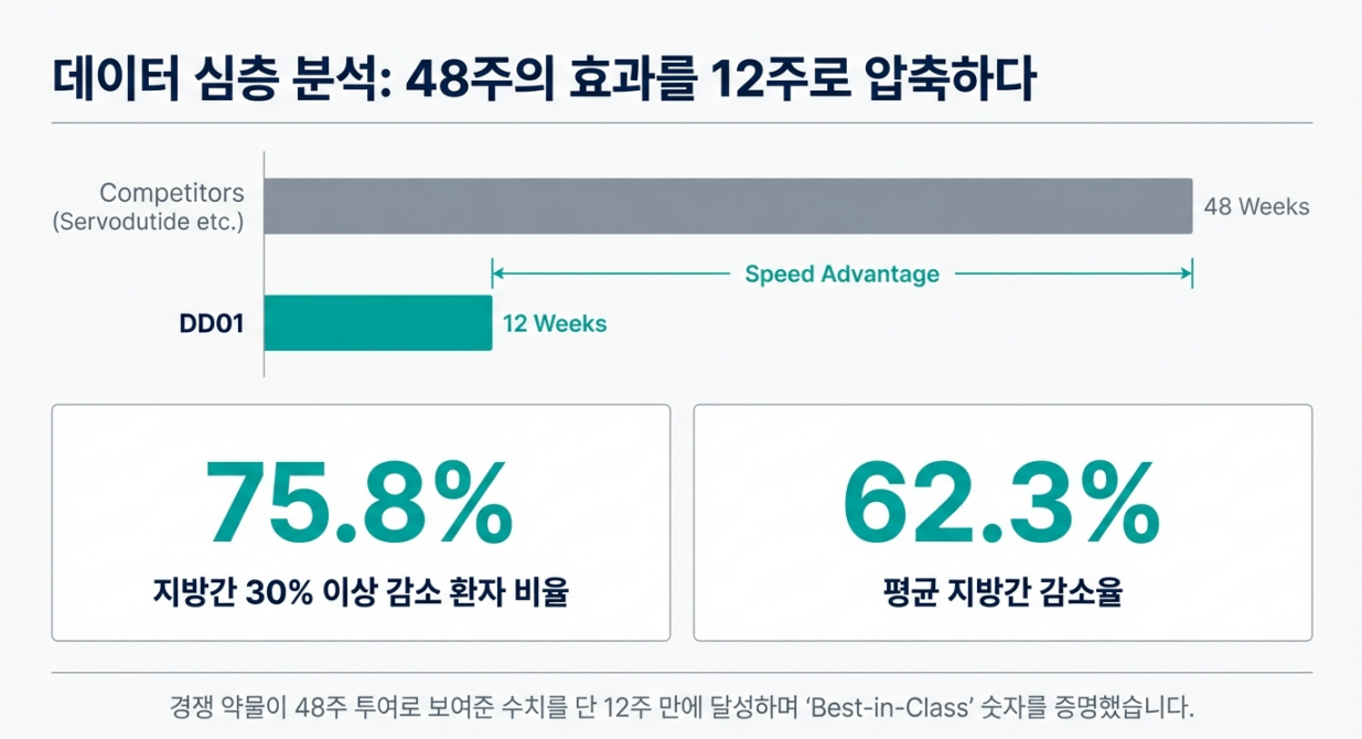 이 수치는 경쟁 약물(대표적으로 GLP-1/글루카곤 계열의 servodutide)이 48주 투여에서 보여준 수준과 비교될 정도로, “12주에 압축”했다는 해석이 붙었습니다.