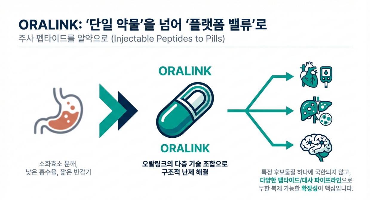포인트는 단순히 “한 개 후보물질”이 아니라, 오랄링크가 여러 펩타이드/대사 파이프라인으로 복제 가능한 구조냐입니다(후속 계약/적용 범위 확대).