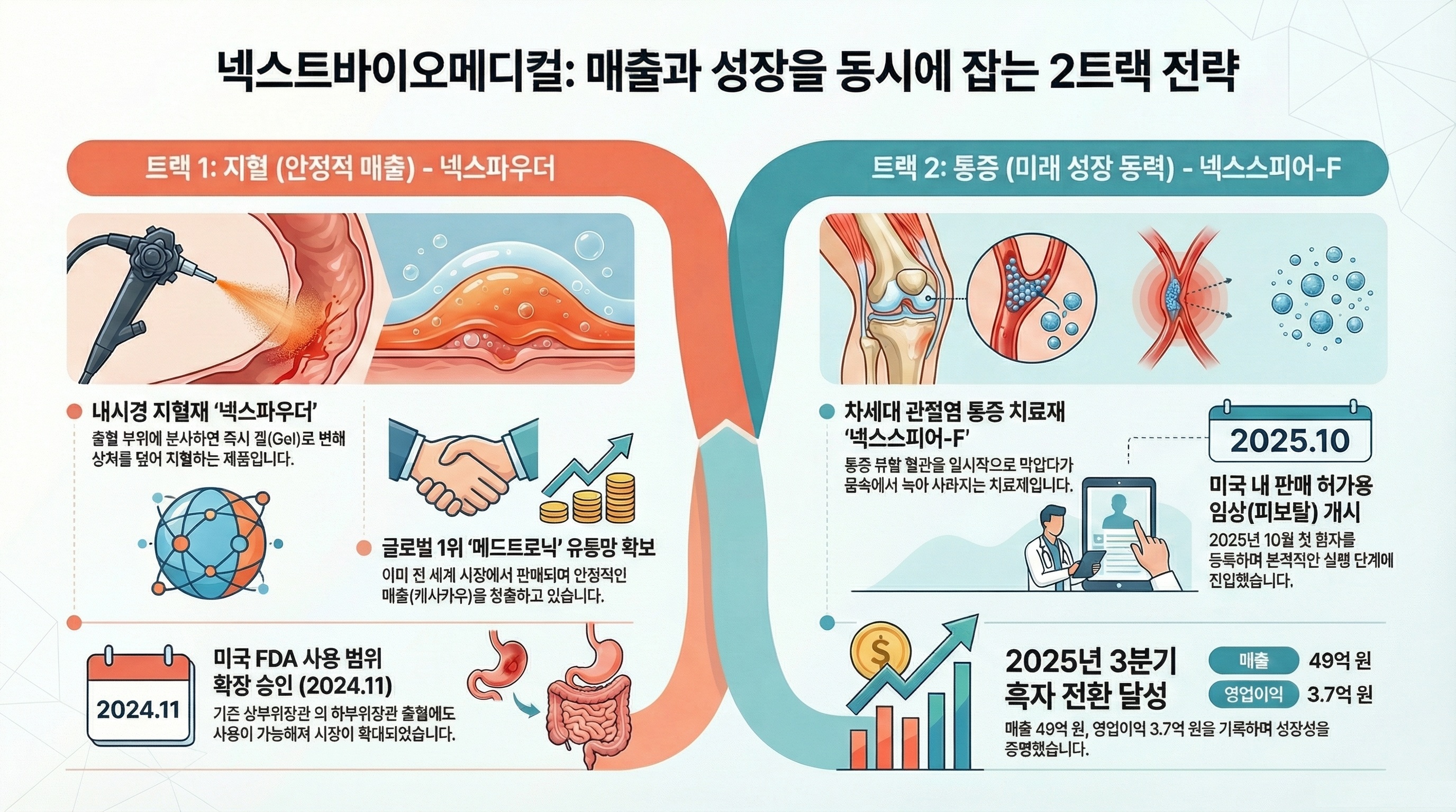 안녕하세요, 주식비서 **로니(Ronnie)**입니다. 👋내일(2026.01.09) 아침, 넥스트바이오메디컬(389650) A리포트를 올립니다.이번 글은 “기대”가 아니라 확인 가능한 팩트로만 정리합니다.**지혈(매출)**은 이미 돈이 돌기 시작했고, **통증(임상)**은 미국 피보탈이 실제로 굴러가기 시작했습니다. ✅ 로니의 3줄 요약(프리뷰)넥스파우더(Nexpowder): 메드트로닉 유통 + **FDA 510(k) K240994(2024-11-27)**로 적응증 확장 → 매출 트랙 강화넥스스피어-F(Nexsphere-F): RESORB 미국 피보탈 첫 환자 등록(2025-10-13) → “계획”이 아닌 실행 트랙 확인**2025년 3Q 흑자(매출 49억/영업익 3.7억)**는 팩트. 이제 시장은 “..